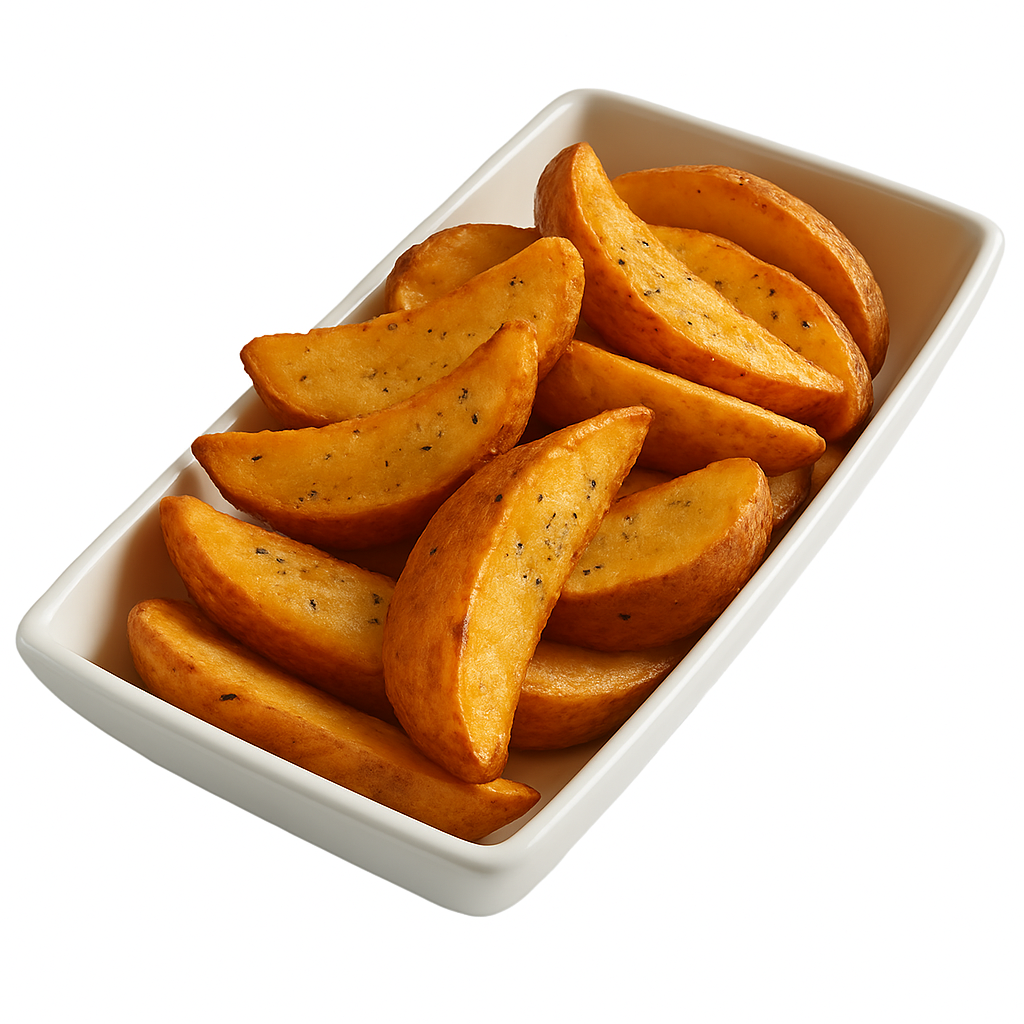 Gajos de papa sazonados y horneados a la perfección. Porción individual de 150 g, ideales para compartir o disfrutar como snack.